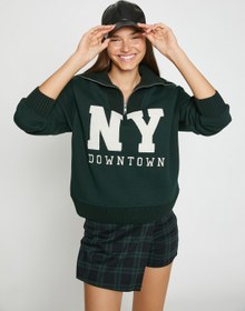 Oversize Sweatshirt İşlemeli Fermuarlı Yaka İçi Polarlı