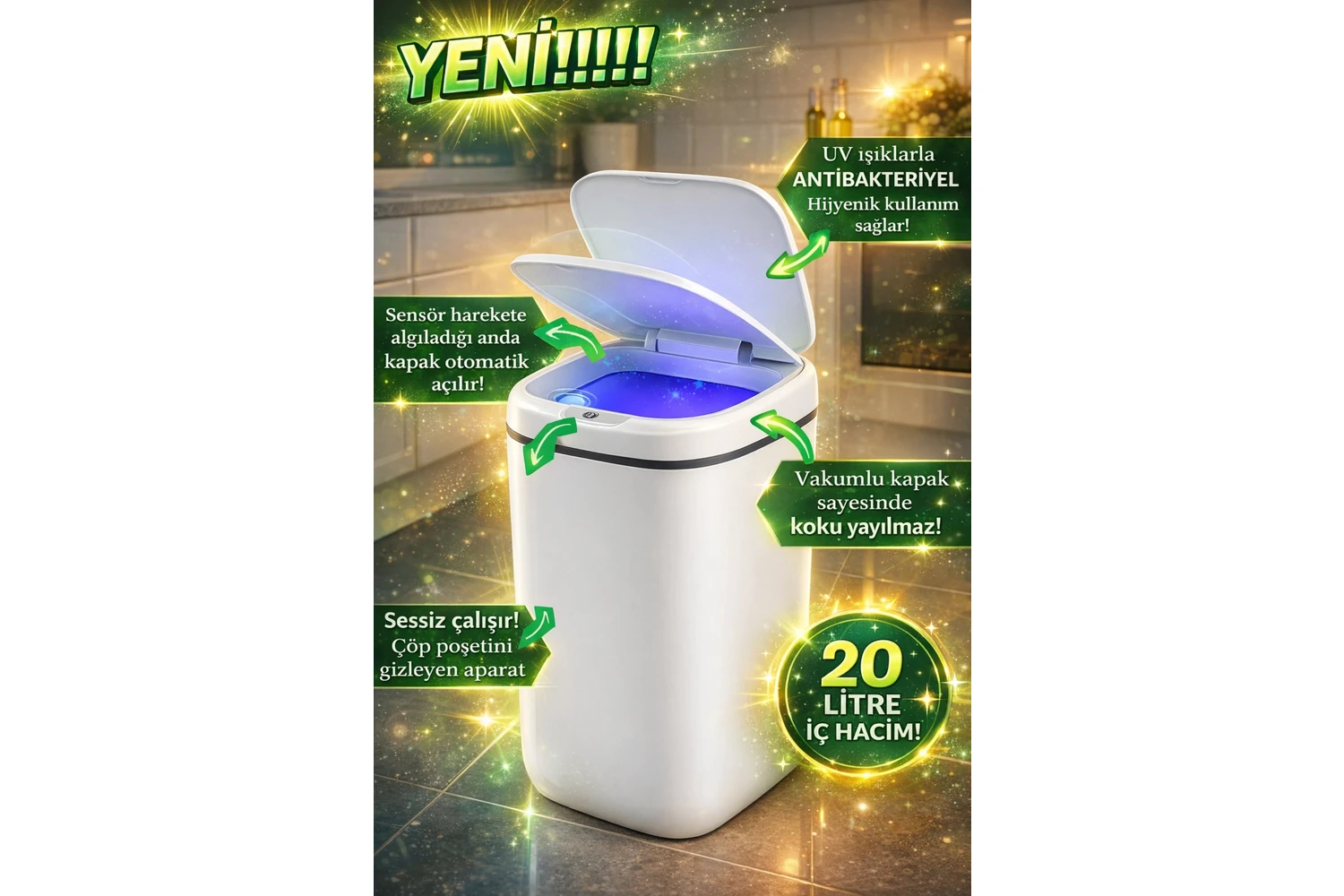Eco Lounge 20L Akıllı Sensörlü Çöp Kovası Uv Işık Koku Geçirmez Mutfak Banyo Wc Ofis