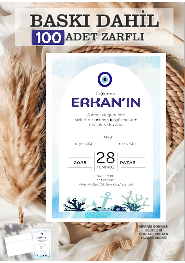 100 Adet Baskı Ve Zarf Dahil Sünnet Davetiyesi Baskılı Zarflı Davetiye Nazar